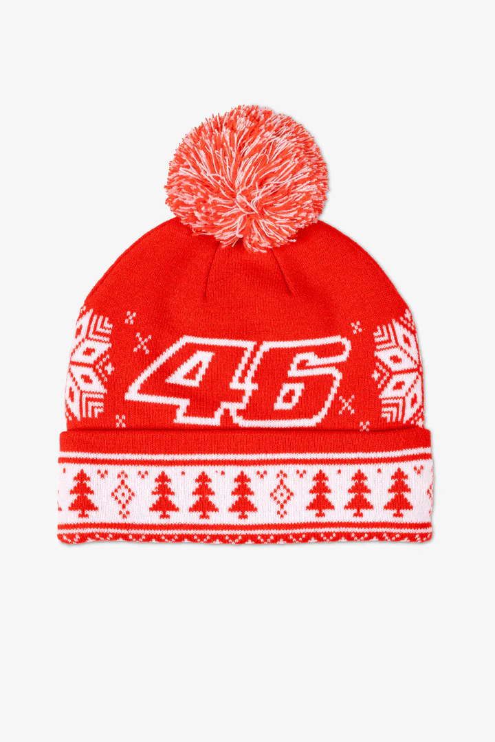 Soft elastic acrylic beanie with pompom dedicated to the VR46 Christmas. It features Christmas-themed graphics with Valentino Rossi’s number 46, snowflakes and Christmas trees.